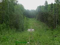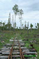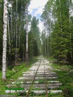 Прорубались мы так уже довольно давно, впрочем, скорость продвижения была медленнее пешеходной. На исходе был бензин, терялось драгоценное время. Порой часть из нас были готовы плюнуть и повернуть назад, но интересно было, куда шёл этот загадочный бесконечный ус. Где-то он должен был закончиться. Интересно было и потому, что давно не встречалось вырубок. Ус шёл то по красивому стройному берёзовому лесу, то пересекал пушистые ельнички. Вот рельсы на белёсом берёзовом кругляке нырнули под ряд корабельных сосен. Лес был чистый, красивый и нерубленый. И рельсы стали как бы ровней. Практически идеальный ус. Отсутствие следов схода сцепов также вводило нас в недоумение. Вагоны не падали, потому что здесь качественно сделали путь? Да нет, вряд ли! Как путь ни клади, вывозка его всё равно раздолбает… Напрашивался другой вывод: лес здесь просто никогда не возили! Тогда зачем этот ус строили? Должен же был быть в этом какой-то смысл!