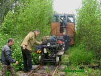 Вереница знакомых плавных кривых вывела нас на поле. На этот раз решили устроить разгрузку здесь. Но одну «пионерку» всё равно придётся тащить через наваленные за перелеском рельсы, чтобы попасть к машинам в Айгу. Разгрузив с ребятами вещи, я пересел на «пионерку» питерцев. Лёха повёз нас с Антоном и Славой в посёлок. За перелеском велась погрузка рельсов на «УРАЛ». Помимо «УРАЛа», на краю поля стоял старенький «Жигуль» металлистов, а на пути узкоколейки – знакомый синий ТУ6Д с платформами. Бригаду тепловоза пришлось просить пропустить нас до разваленных в колее рельсов, не то обносить бы пришлось слишком много.
