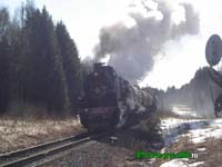 Пока здоровались с друзьями и знакомыми, графиковые поезда разошлись, пути опустели, и наш специальный поезд стал готовиться к отправлению. До станции Овинище он должен был следовать без остановок, поэтому мы решили сопровождать его на машине, фотографируя по пути. На первый фотостоп отправились заранее. Точка съёмки была выбрана рядом с Сонково, в двух километрах от станции, на переезде. Железная дорога здесь аккуратно выныривала из галереи ёлочек, пересекала шоссе и уходила в левую кривую. После нескольких минут ожидания со стороны станции послышался характерный звук паровозной отсечки. Его никак нельзя было перепутать с ворчанием тепловозного дизеля. Выпуская в небо хлопья белого дыма, чёрный паровоз приблизился к переезду, издал мощный гудок. Шипя, пролетел мимо, загрохотал по стыкам состав. Процессию замыкал прицепленный в хвосте тепловоз ТЭМ2. Ему суждено было транспортировать поезд с паровозом назад из Весьегонска. Не без интереса наблюдали мы, как перед самым паровозом из остановившегося у переезда «жигулёнка» с местными номерами выскочил удивлённый паренёк и стал снимать проход поезда на сотовый телефон
