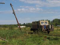 29-й километр ГКЖД, ст. Лесная. В десятом часу утра в среду, 22 августа, мы грузим свои пожитки в дрезину с идентификационным номером 12184. Когда-то это была АГМка. Теперь на ней место грузовой платформы и крана занимал самодельный пассажирский кузов. Он был снабжён двумя торцевыми окнами и только одной дверью, слева от кабины водителя. Такое «аскетичное» остекление «пассажирского салона», видимо, объяснялось необходимостью экономить тепло во время суровых местных зим. Помимо приданного нам водителя и офицера сопровождения (молодого лейтенанта), дрезинка набилась неожиданными попутчиками. Муж с женой ехали в Брусничный. Ещё одна дама с суровым видом везла какие-то документы в Койгородок. Удивительно, как оперативно работает «народное» радио. Мужик по сотовому пытался вызвонить своих друзей, как я понял, «для продолжения» начатого где-то в Лесном «банкета».